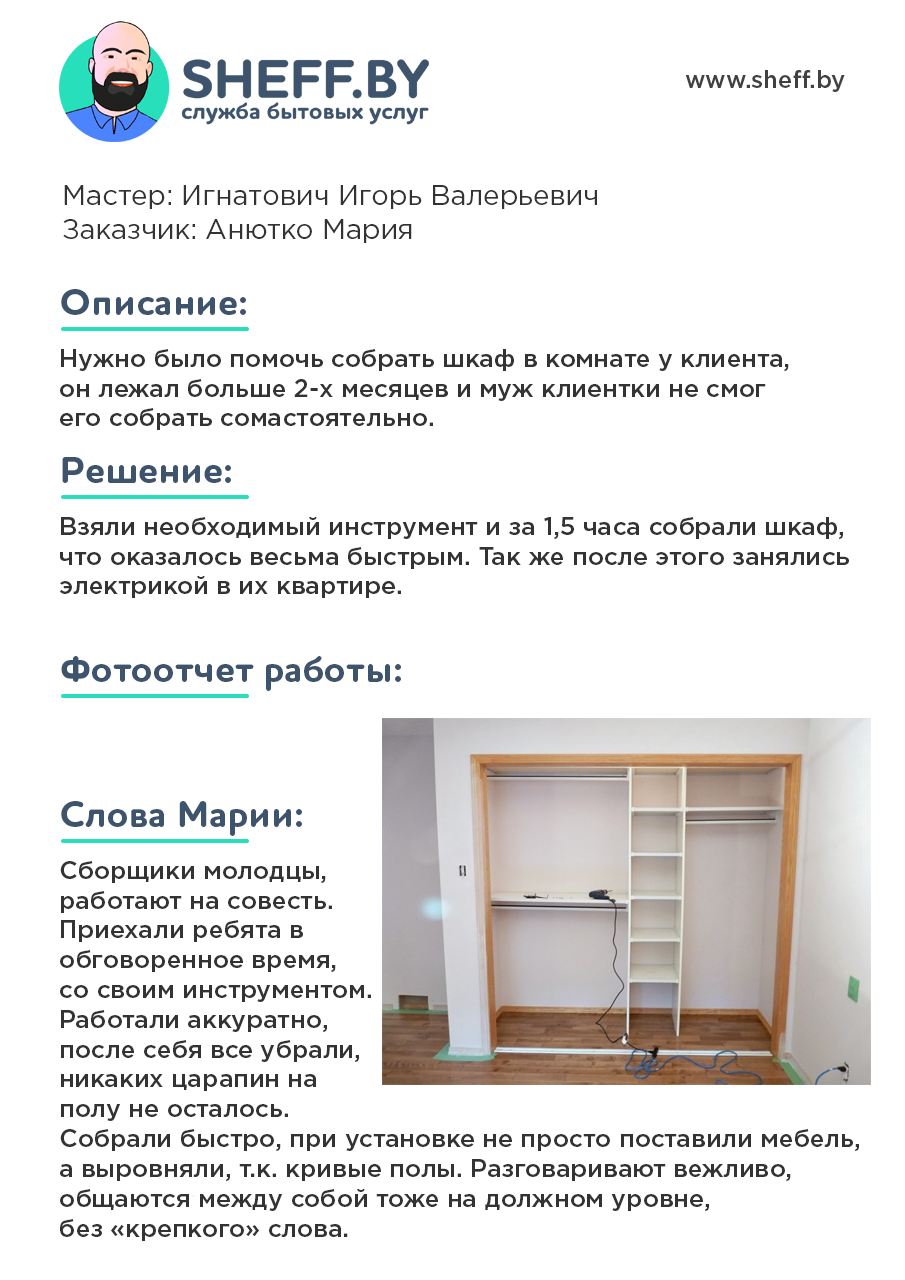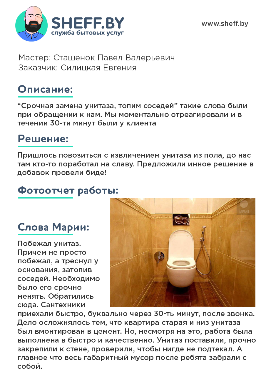 Однако с нашими мастерами такие ситуации практически невозможны – для жителей Минска мы отобрали лучших сантехников, электромонтажников, плотников и других специалистов, которые выполняют работу на совесть и доводят задачи до логического завершения.